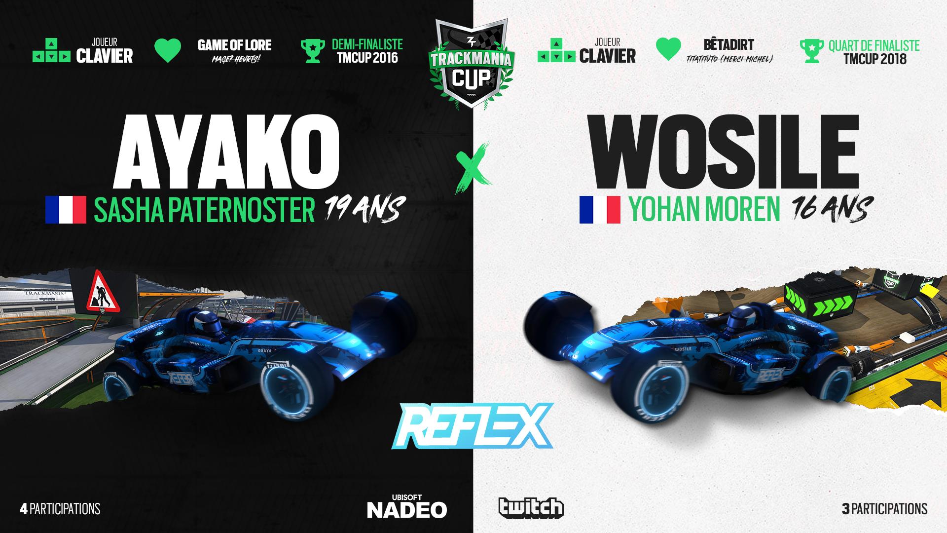 Le quatrième duo de notre série est l’équipe Reflex,. Elle se compose de Sasha "Ayako" Paternoster et Yohan "Wosile" Moren. Ayako a participé à la demi-finale de la ZrT Trackmania Cup en 2016. Wosile, de son côté, s’est arrêté aux quarts de finales de la dernière édition.