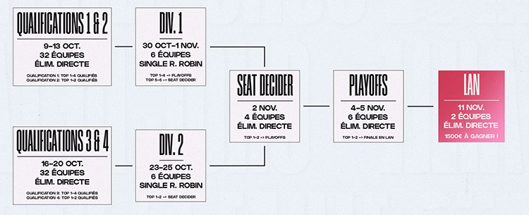 Vous pouvez vous inscrire aux étapes de qualifications en suivant ce lien. Pour être éligible en tant qu'équipe à ce tournoi :