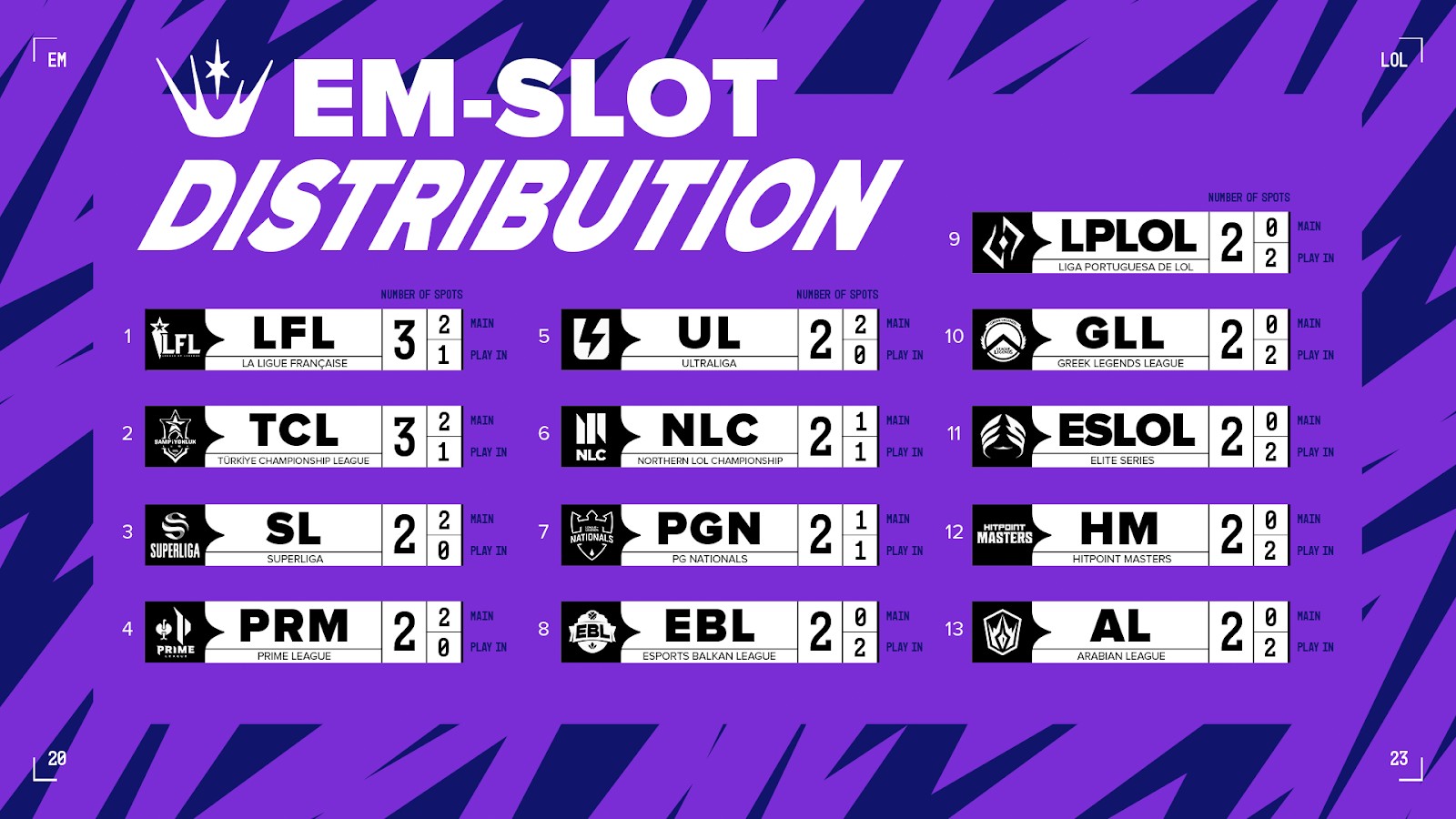 Voici la répartition du nombre d'équipes qui seront invitées dans chaque ligue pour l'EMEA Masters du Spring Split :