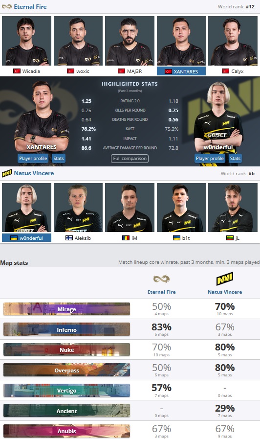 Face à eux se dresse une équipe qui ne cesse de s’améliorer, avec un Aleksib pointilleux comme jamais, les NAVI devraient pouvoir s’appuyer sur leur LIG afin de contrarier l’adversaire turc. Les Européens avaient déjà mis les EF en déroute lors des IEM Katowice, où la bande à woxic avait tout de même réussi à remporter Nuke 13-11, mais NAVI avait prouvé sa supériorité en leur infligeant les scores de 13-5; 13-8 sur Anubis et Mirage. Les NAVI sont favoris d’une petite longueur, mais un mix de motivation et grinta des troupes turques pourrait mettre à mal le navire jaune et noir. Vous le savez, la surmotivation et la fierté de tout un peuple sont toujours une donnée difficile à exploiter pour réaliser ses pronostics : place au spectacle.