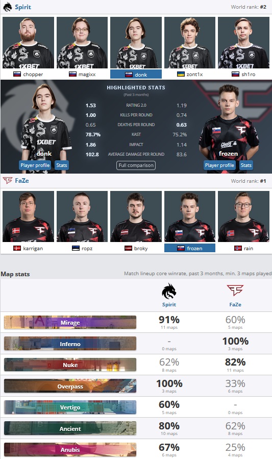 La furia Spirit va-t-elle s’éroder sous la pression de l’enjeu ? Rien n’est moins sûr, nous avions pu constater cela lors des IEM en Pologne. Donk du haut de ses 1.53 de rating, ne baisse pas d’intensité depuis le début de saison. En témoigne la série de 7 matchs d’invincibilité en cours de Spirit, qui s’est notamment offert NAVI, Imperial et Cloud9 depuis le début de son major. Du côté de chez FaZe, l’équipe semble toujours aussi solide, mais la défaite en Elimination Stage 13-1 face aux Eternal Fire fait tache, tout comme la contre-performance réalisée face à Heroic. La qualification a finalement pu être sécurisée grâce à des victoires, tout comme pour Vitality, contre des équipes d’underdogs telles que coL, Imperial et FURIA. La soirée s’annonce passionnante.