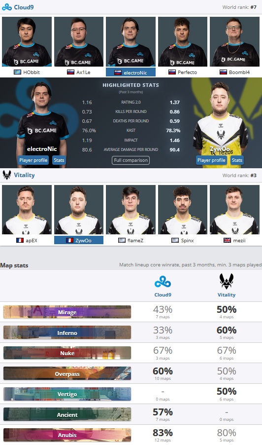Le dernier match du vendredi opposera deux formations européennes plutôt en forme ces derniers temps. Un match au sommet entre les quatrième et cinquième formations du classement mondial qui devrait nous réserver pas mal de surprises. Sur le plan de la dynamique à l’instant T, les performances récentes de Mouz qui ne s’est pas incliné depuis 6 matchs et qui s’est offert le luxe de passer en playoffs avec un 3-0 bien propre, devrait conférer un boost psychologique aux hommes de siuhy. Les victoires de Mouz face à EF, coL et Ecstatic ne sont pas des assurances, mais le 2-0 infligé à Spirit lors du RMR en finale de groupe, nous laisse-lui pour le coup très pensifs. Certes, le match n’était pas à enjeux à l’instar du Vitality - Cloud9, mais la statistique reste de bonne facture à l’approche de ce quart de finale.
