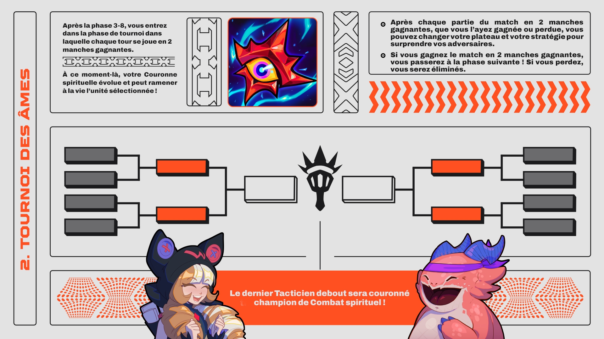 - Pendant la phase de tournoi, la Couronne spirituelle imparfaite se transforme en sa version perfectionnée. Elle offre donc des stats supplémentaires et permet de ramener le champion équipé à la vie la première fois qu'il meurt.