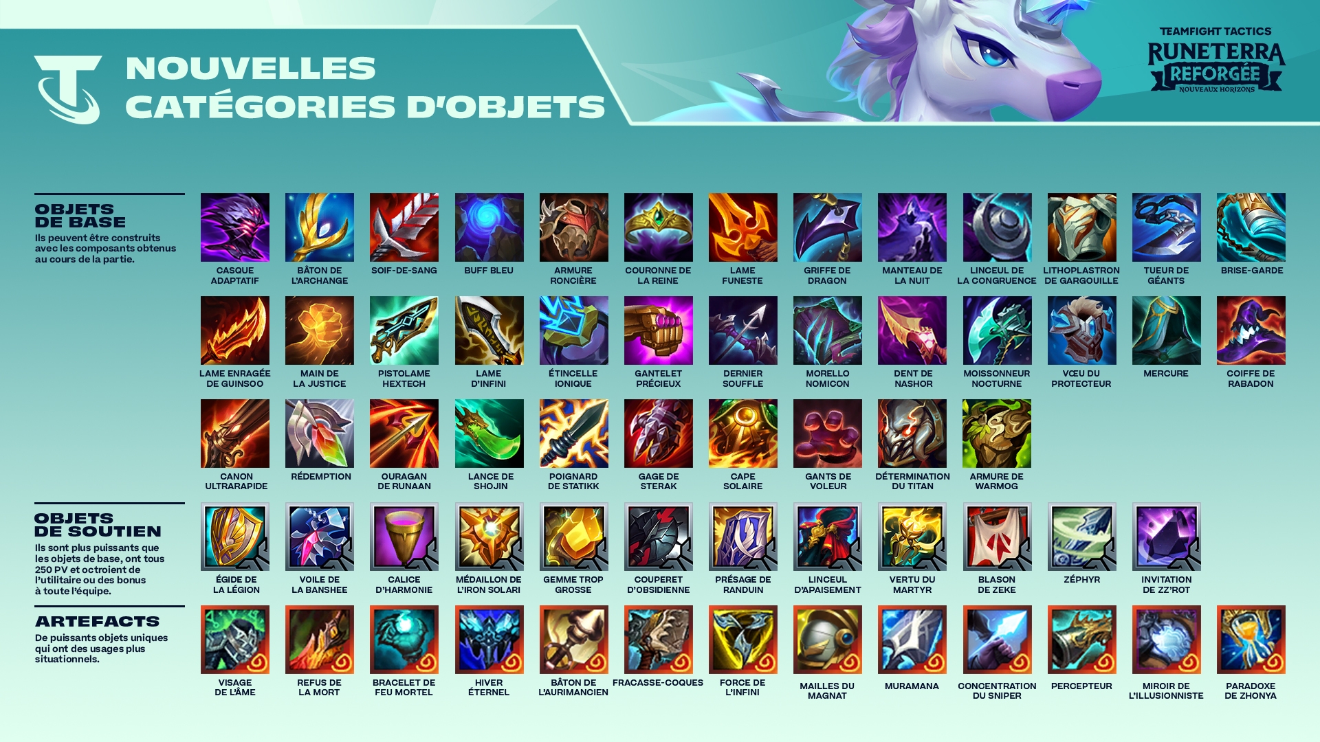 Artefacts : anciennement « objets d'Ornn », ce sont des objets impossibles à fabriquer qui proposent des combinaisons et synergies puissantes.