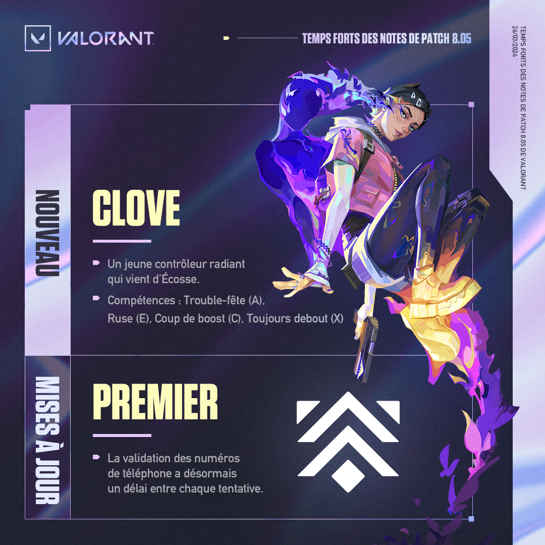 Découvrez toutes les informations concernant le patch 8.05 sur Valorant. Au programme cette semaine, un tout nouvel agent : Clove. Iel est originaire d'Écosse et vient compléter les rangs des contrôleurs. Il y a aussi une petite mise à jour pour Premier, des indicateurs de chat vocal et quelques corrections de bugs.