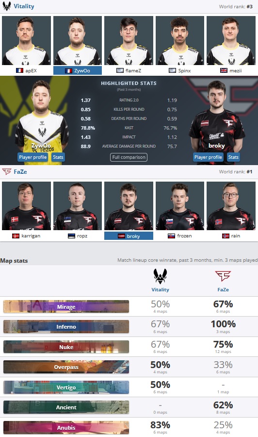 Le Faze Clan a déjà disputé un match digne d’une finale de major face à Team Spirit. Accrochés, mais jamais battus, les hommes de Karrigan ont fait preuve d’une résilience incroyable face aux intenables Spirit. Il aura fallu deux overtimes à FaZe pour venir à bout des Russes, un type de match difficile, donc, que Vitality n’a toujours pas connu lors de ce major. Larges vainqueurs de Cloud9 13-8 ; 13-2 sur Inferno et Anubis, les coéquipiers d’Apex n’ont eux, pas eu à batailler afin de rejoindre le dernier carré de la compétition. Les deux équipes sont dans dans dynamiques jusque là assez différentes et cela pourrait bien influencer la rencontre de ce samedi. Les hommes clés de la rencontre ne sont nul autre que ZywOo et broky, deux joueurs qui vont devoir mettre en avant leur talent s’ils veulent voir leurs équipes s’imposer. Mathieu n’a pas été Zywooesque depuis le début de la compétition, mais c’est bien dans ce genre de match que son talent pourrait faire la différence.