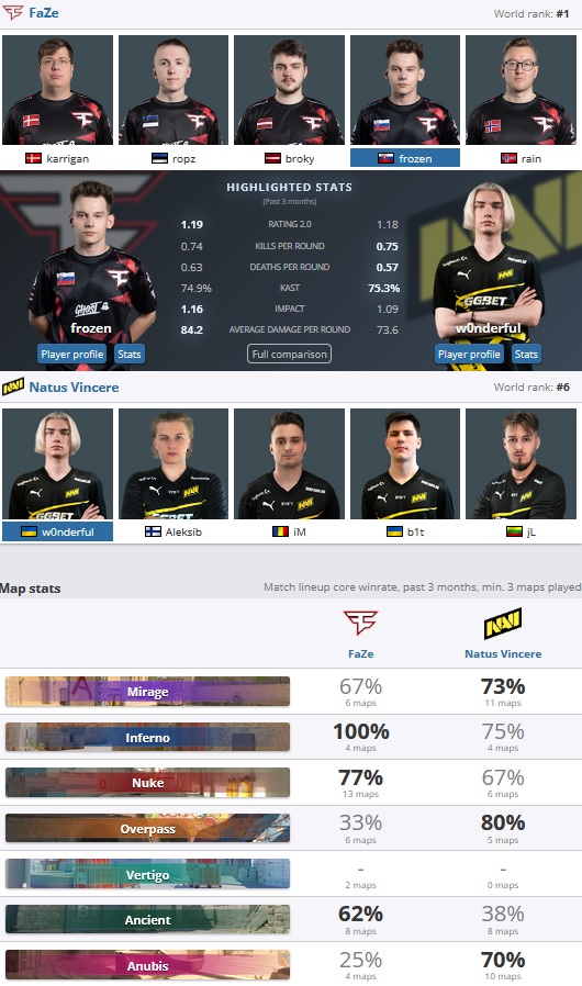 Les leaders Karrigan et Aleksib vont s'affronter devant une Royal Arena qui aura sans aucun doute choisi son camp avec le joueur danois. Mais un autre duel risque de faire des émules sur le serveur. Celui des snipers, entre w0nderful et broky, deux joueurs qui ont largement participé à l'avancée de leur équipe vers cette grande finale. Les FaZe Clan semblent être favoris sur le papier, mais gare aux coups de maître de B1ade et son carnet de notes. La seule certitude que nous avons est celle d'un vainqueur qui aura durement mérité sa victoire, tant ces demi-finales furent accrochées.