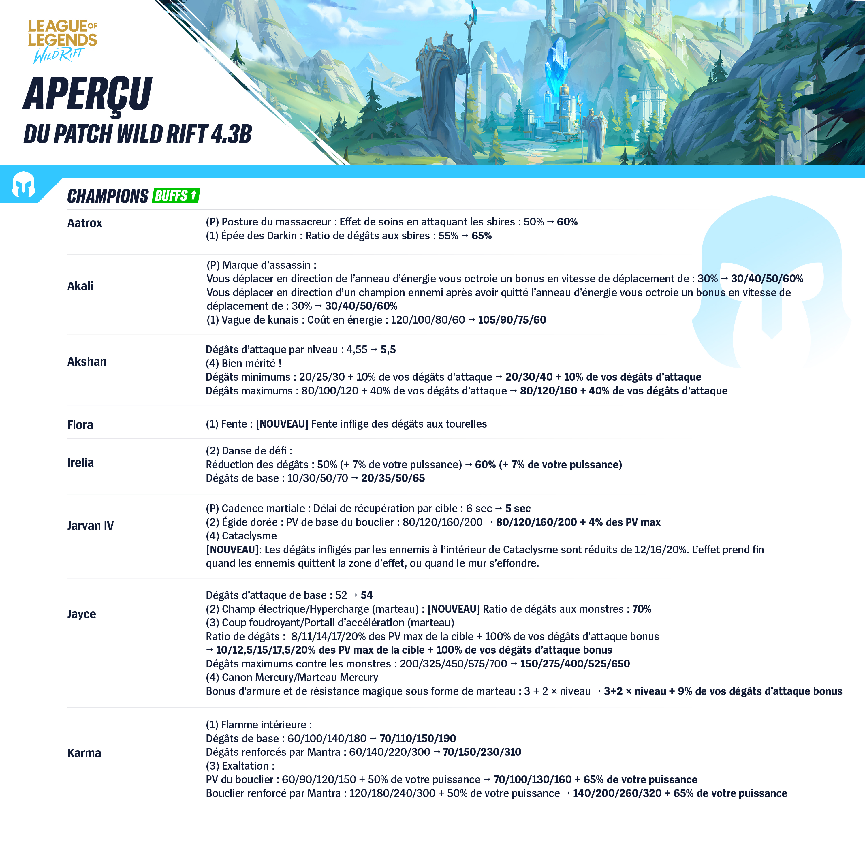 Le patch 4.3b va bientôt faire son apparition sur les serveurs live de League of Legends Wild Rift, et à cette occasion, Riot Games a dévoilé une liste non exhaustive des différents équilibrages qui seront mis en place avec cette mise à jour ; la liste complète de tous les changements sera normalement dévoilée d'ici ces prochains jours. Dans les différents équilibrages dévoilés ce jour, nous retrouvons de nombreux buffs notamment Aatrox, Akali, Jayce, Pyke et Karma, ainsi que des équilibrages sur les runes.